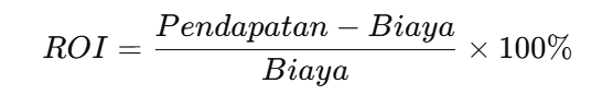 Return on Investment adalah rasio yang membandingkan keuntungan bersih yang dihasilkan dengan jumlah investasi yang dikeluarkan. Dalam konteks digital marketing, Return on Investment menunjukkan seberapa besar keuntungan yang Anda dapatkan dari setiap rupiah yang diinvestasikan dalam kampanye.